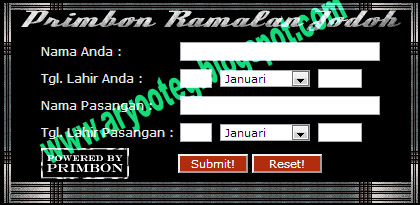 Bagi anda yang ingin mendapatkan ramalan jodoh khususnya dengan primbon anda bisa mendapatkannya dengan mendownload aplikasinya. namun sayangnya disini tidak menyediakan aplikasi primbon tersebut, jadi anda bisa mencarinya di situs-situs yang lain. Namun jika agan ingin meramal tentang perjodohanya,agan bisa meramalnya di blog aryo yang ada dibawah.. Sebelum mengakhiri, namanya ramalan hanyalah sebuah ramalan jadi anda tidaak harus mempercayainya 100%. Dan akhir kata, semoga informasi mengenai ramalan jodoh ini dapat memberikan pengetahuan yang lebih untuk anda.